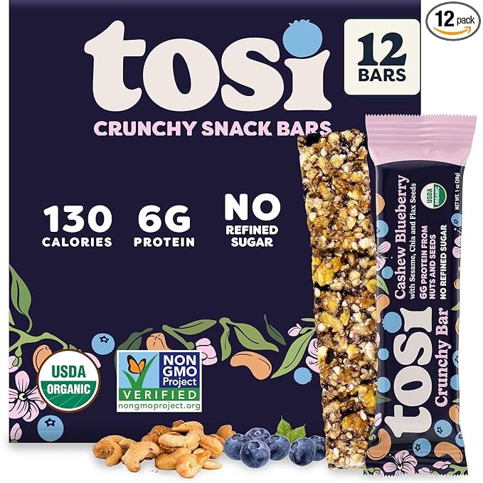 Tosi Cashew Blueberry Protein Bars – Crunchy Nut & Seed Vegan Snack Bars, Gluten Free, 6g Plant Based Protein, Organic Flax, Chia, Sesame Seeds, Omega 3s, Low in Sugar, No Soy – 1 oz, 12-Pack