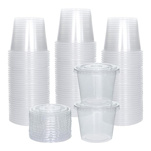 - Pack of 100 – Plastic ramekins with lids, ketchup cups, sacrament cups, mini portion cups with lids; use for salad dressing, slime & medicine or your favorite dip